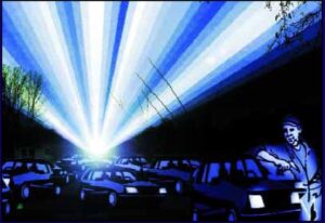 Ich fuhr in Richtung Köln zurück (Vorgeschichte), durch die Orte Niederaußem und Glessen, nach Brauweiler. An der Einmündung der L 350 bemerkte ich, dass die ominöse Disco-Veranstaltung immer noch im Gange war, was an den weithin sichtbaren Lichtstrahlen deutlich zu sehen war. Spontan, beschloss ich die Veranstaltung, auf dem Rückweg etwas genauer anzusehen, wenn ich schon keine Ufo-Raumschiffe gesehen hatte (ich ahnte noch nichts…). Als ich den Rand von Pulheim erreicht hatte, stieß ich, zu meinem Ärger, auf eine, min lange 1 km Autoschlange. Stau, Wagen die alle rechts Abbiegen wollten, um ins Autokino, zu der ominösen „Veranstaltung“ zu kommen! Längst sah man die rotierenden Lichtstrahlen.